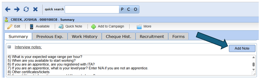 To add a new Interview Note go to the worker’s Person file and click the Add Note Button in the Interview Notes area.