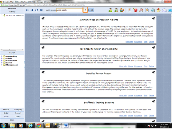 Located at the top of your screen is a Quick Search that allows you to find a person, company or order easily from the main login screen or at any time while you are in Stafftrak.